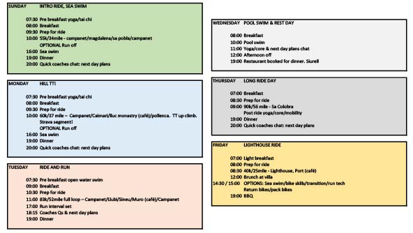 We pride ourselves on being able to customise the week’s training based on our guests needs, so if you are training for long course we include longer rides and runs, if you are training for short course AG racing we include transition practice and shorter more intense sessions.